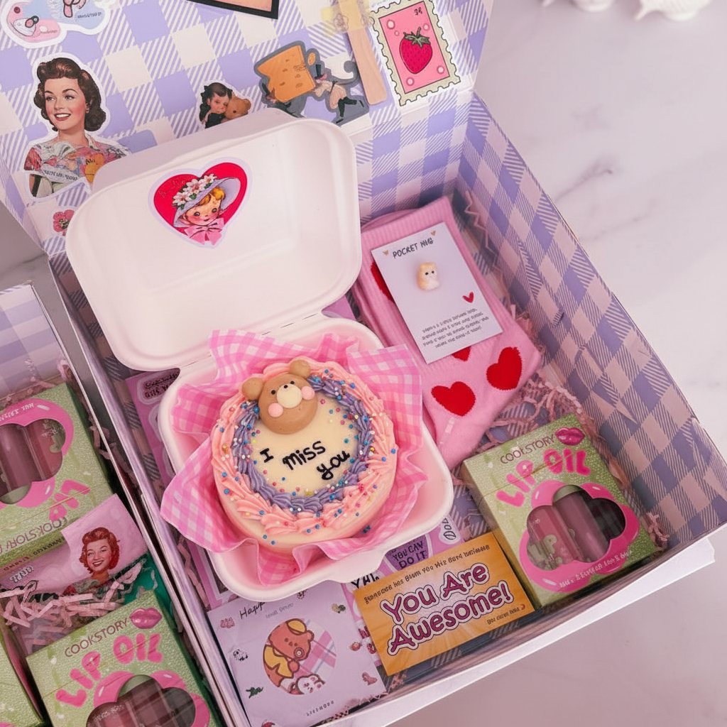 Cake, lip gloss set, socks, pocket card, mirror, sticker