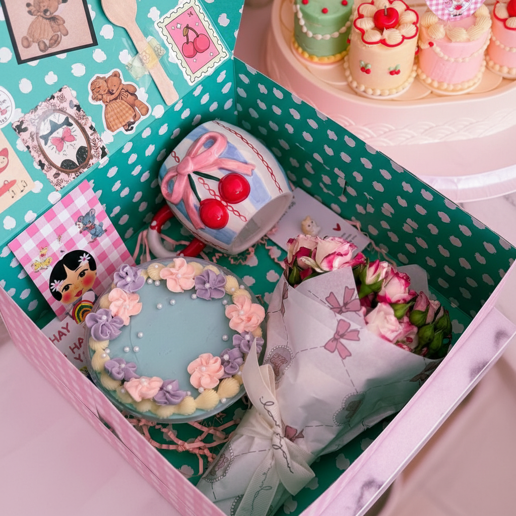 Cake, fresh rose bouquet, mug , card , sticker