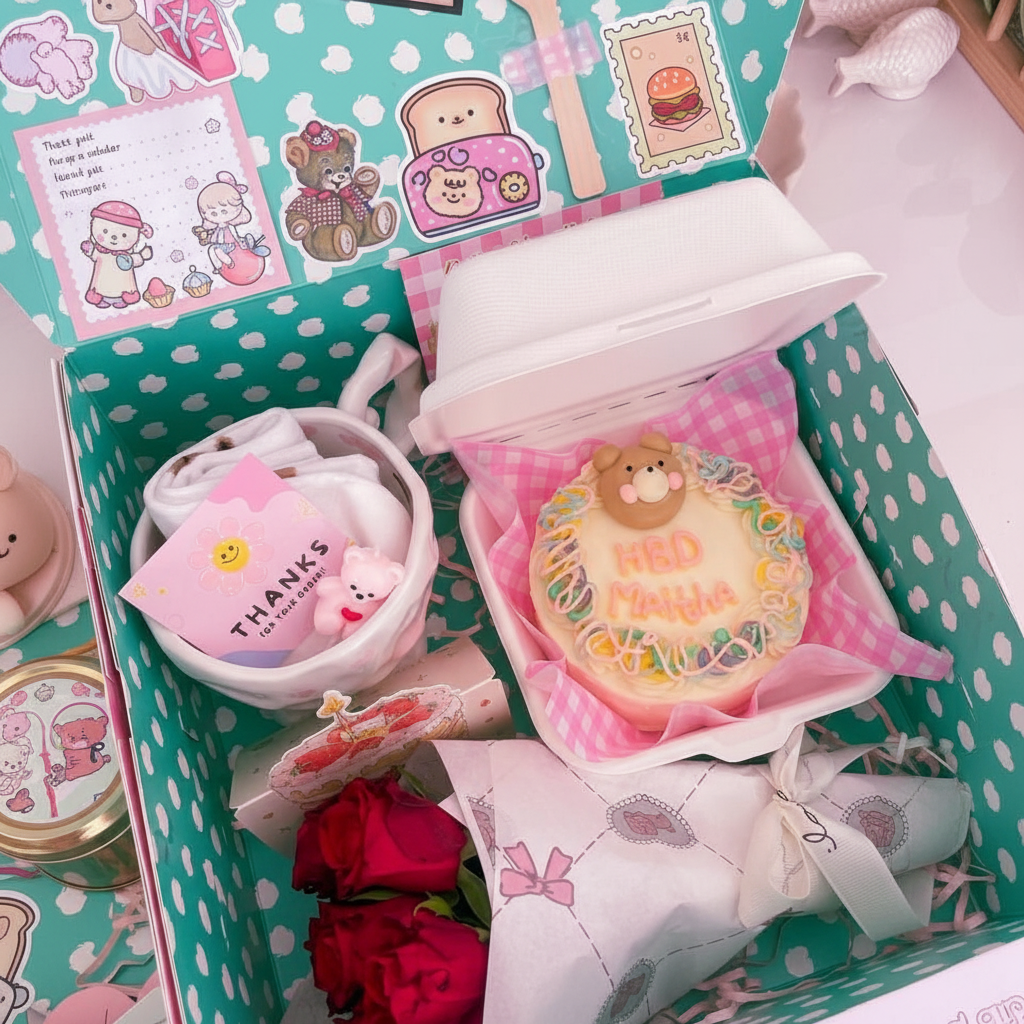 Cake , mug , fresh rose bouquet, socks , candle, sticker
